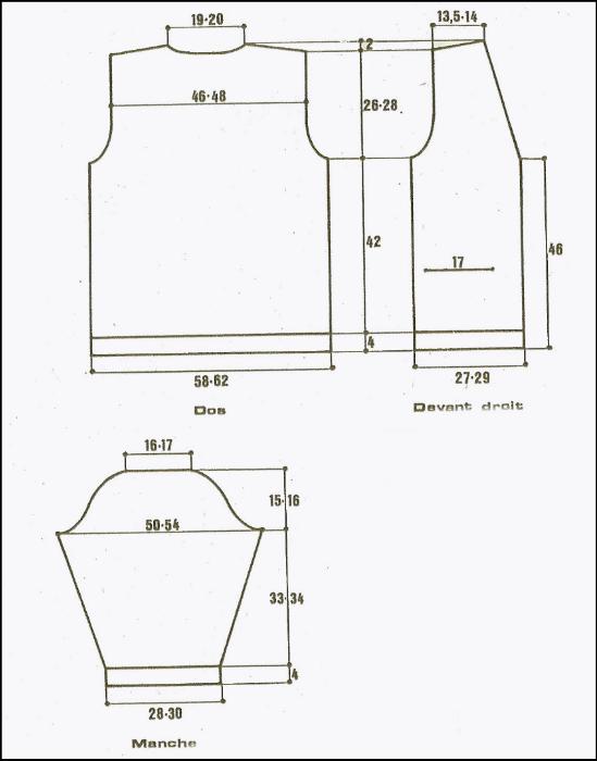 Monter 363 - 373 m. Tric. 4 cm en côtes 1/1 et laisser en attente, mais à mi-hauteur, former 5 boutonnières de 3 m., la 1ère à 5 m. du bord, les autres espacées de 17 m.