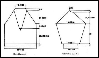 Monter 74 - 78 - 82 m. Tric. 4 cm côtes 2/2 en répart. 20 - 22 - 24 augm. au dernier rang. Cont. jersey endr. sur les 84 - 100 - 106 m. obtenues en augm. de ch. côté.