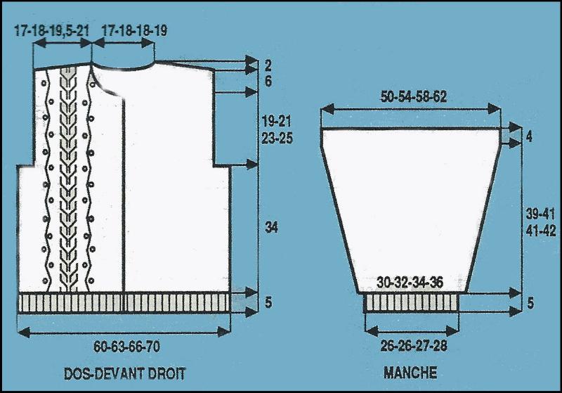 12 m. zigzag en commençant au 1er rg, 12 m. torsade, 12 m. zigzag en commençant au 15ème rg (= 7 m. env., 3 m. croisées à droite, 2 m. env.), 52 m. point fant. (en commençant par 2 m. croisées à gauche, 2 m. croisées à droite), 12 m. zigzag en commençant au 1er rg, 12 m. torsade, 12 m. zigzag en commençant au 15ème rg (= 7 m. env., 3 m. croisées à droite, 2 m. env.), 31 - 37 - 43 - 49 m. point fant. (en commençant par 2 m. croisées à gauche, 2 m. croisées à droite).Emmanchures