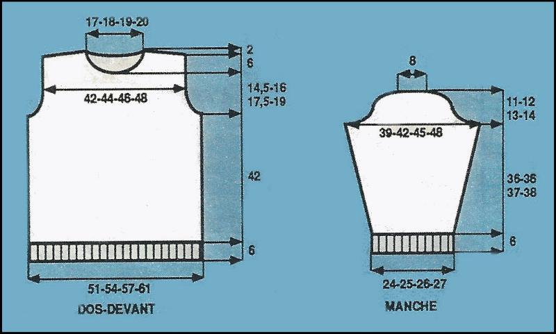 Veste: 9 - 10 - 11 - 12 pelotes bleu et 2 pelotes rouge
