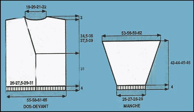 À 14.5 - 16 - 17.5 - 19 cm de haut. d'emmanchures, rab. les 15 - 17 - 19 - 21 m. centrales. Cont. ch. côté séparément en rab. côté encolure ts les 2 rgs: 1 fs 3 m., 2 fs 2 m., 7 fs 1 m.