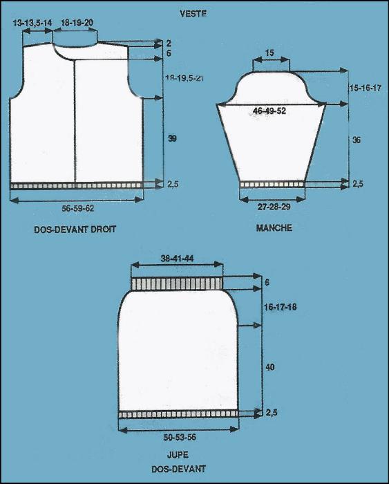 Monter 59 - 63 - 65 m. Tric. 2.5 cm en côtes 1/1 en dim. 1 m. au dernier rg pour T.44. Cont. droit en jersey endr. plissé (former le premier pli à 20 m. du bord milieu devant)