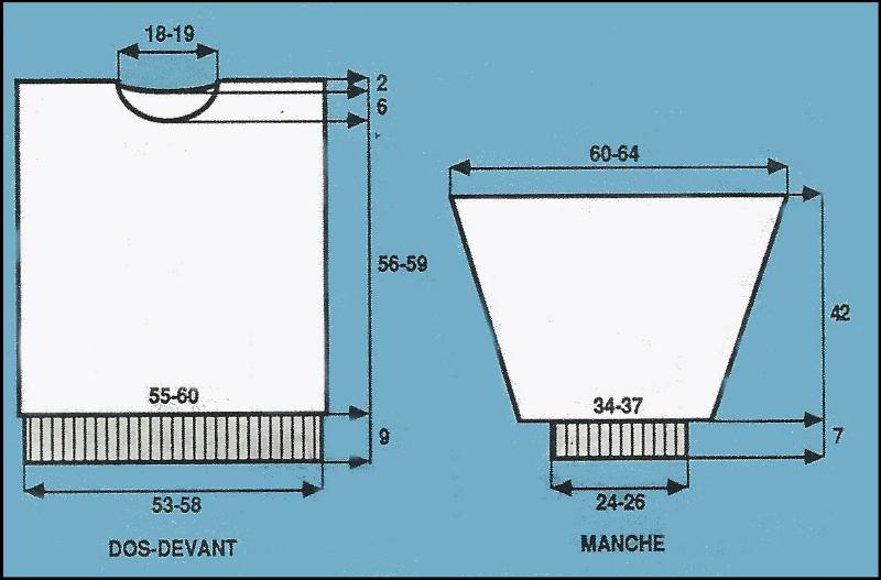 Monter 50 - 54 m. Tric. 7 cm en côtes 2/2 en répart. 48 - 52 augm. au dernier rg. Cont. au point fant. sur les 98 - 106 m. obtenues en commençant: