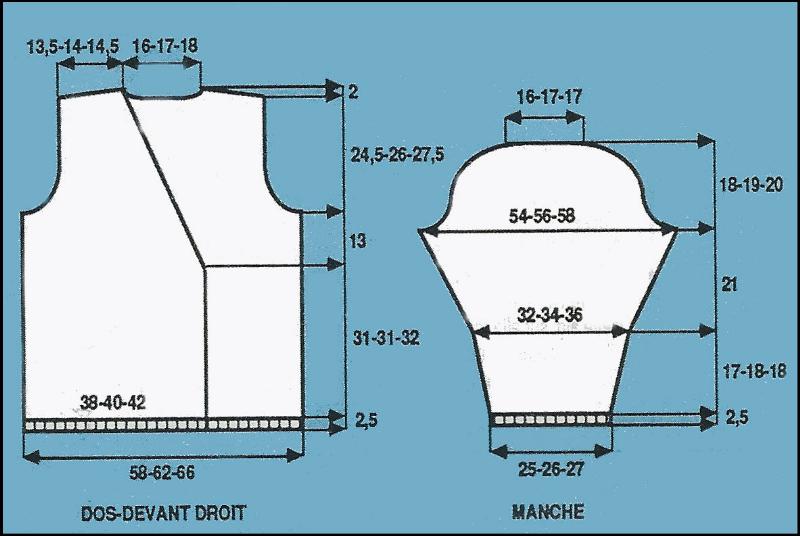 T.46: *2 fs 1 m. ts les 2 rgs, 1 fs 1 m. ts les 4 rgs*. Rab. de * à * 8 fois, 11 fs 1 m. alternativement ts les 2 et 4 rgs.Emmanchure et épaule