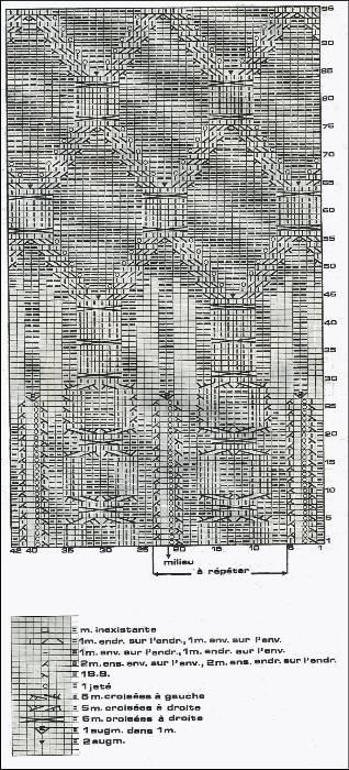 T.42: à la m. 3 de la grille (= 4 m. env., 6 m. endr.) et en augm. de ch. côté 7 fs 1 m. ts les 10 rgs.