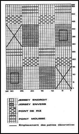 Monter 119 - 127 - 133 m. Tric. 6 cm côtes 1/1 en répart. 9 augm. au dernier rg. Cont. droit point fantaisie sur les 128 - 136 - 142 m. obtenues en commençant: