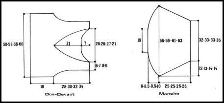 Comme le dos, mais pour l'encolure, à 12 - 13.5 - 14.5 - 16.5 cm de haut. tot., rab. à droite ts les 2 rgs 1 fs 6 m., 20 fs 3 m. À 13 - 13 - 13.5 - 13.5 cm de haut. d'encolure, augm. en sens inverse.