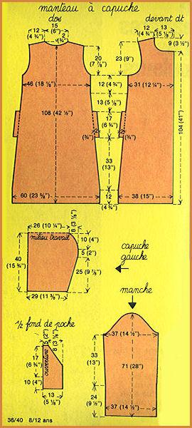 Repasser sur l'env. à la pattemouille. Piquer les coutures des côtés en laissant les fentes des poches ouvertes; coudre le dos de la capuche. Fermer les manches: piquer la hauteur des côtes plates et coudre au point de surjet plat la hauteur des rgs mousse, au bas de chaque manche pour que, retournés, ils ne montrent pas de couture apparente. Monter les manches. Coudre le bas de la capuche dans l'encolure du manteau, en couture normale faite sur l'envers, puis repasser l'épaisseur de cette couture, rabattue sur le manteau et surpiquer à 0.5 cm de la 1ère couture de montage de la capuche.