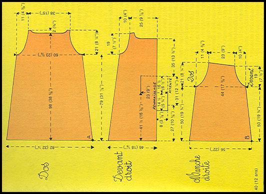 Se commence au point "A" du schéma, bas du manteau et couture droite de côté. Pour la symétrie des côtés et pour que les rayures se rejoignent, face à face, dans les coutures des côtés, commencer comme suit: en couleur marine et vert, monter 16 m. et tricoter 3 rgs de jersey envers. Continuer alors en jersey rayé, en inversant l'ordre des rayures c'est-à-dire, après les 3 rgs en marine et vert, tric. marine et écru et ainsi de suite jusqu'au milieu du dos (= 21ème rayure) en marine et bleu foncé. Continuer alors en rayures dans le même ordre que celui suivi pour les devants, pour terminer sur une rayure de même couleur que la fin des devants. Simultanément, au 2ème rg et ts les 2 rgs, augm. à droite, vers l'encolure: 10 fs 8 m., puis tric. 2 rgs droit.