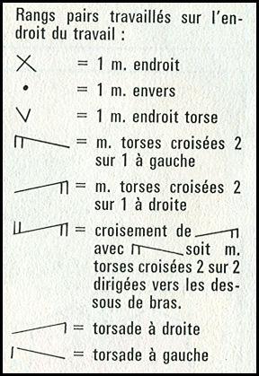 Exemple: 1 m. env. normale signifie que, sur l'endroit du travail, cette m. est tric. à l'env.; (1 m. end. torse) signifie que cette même m. doit être tric. à l'end., torse, sur l,env. du trav. Les 16 m. du mil. sont au point d'alvéoles avec, de part et d'autre: 1 m. env. normale (1 m. end. torse), 1 m. end. torse (1 m. env. torse), 1 m. env. normale (1 m. end. torse), 4 m. torsade, 1 m. env. normale (1 m. end. torse), 1 m. end. torse (1 m. env. torse), ■■ 1 m. jersey envers (1 m. end. torse), 2 m. end. torses (2 m. env. torse), puis 6 fs: 1 m. end. sur end. et 1 m. env. sur env. qui deviendront des m. au point de blé, puis 2 m. end. torses (2 m. env. torse), 1 m. jersey envers■■ et terminer par 1 m. end. torse (1 m. env. torse) et 1 m. lis.; ceci pour la taille 40. Pour la taille 44, la disposition est la même jusqu'à la m. placée contre la m. lis.; mais entre celle-ci et la m. suivante (ou précédente) on intercale 1 m. env. normale et 2 m. de point de blé c'est-à-dire 3 m. de plus de chaque côté du trav., pour terminer la m. lis. D'autre part les 18 m. entre ■■ et ■■ forment le motif à losanges avec, de chaque côté, 2 m. torse qui doivent, à droite du motif, être croisées vers la gauche avec la 1ère des m. au point de blé; cette 1ère m. doit être tric. à l'env. (même quand elle se présente à l'end.) pour augmenter les m. en jersey env. des côtés de cette bande; et à gauche du motif, les 2 m. torses doivent être croisées vers la droite avec la dernière des m. au point de blé, qui doit être tric. à l'env. (même quand elle se présente à l'end.) pour augmenter les m. en jersey env. des côtés de cette bande.