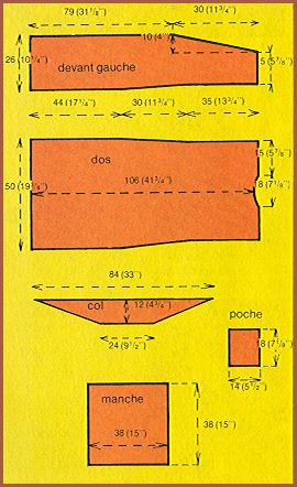 Avec la laine amande, faire une chaînette de 66 m. pour le travail, plus 1 m. pour tourner, ceci pour les 2 tailles. Travailler droit, au point de demi-bride rayé, en suivant les rayures du dos, mais en ne faisant que 2 rgs amande au début. À la fin de la 12ème (13ème) rayure, on a atteint le milieu de la manche; reprendre les rayures en inversant les explications ◙ pour que les 2 côtés soient en vis-à-vis. Arrêter à la fin de la 23ème (25ème) rayure.