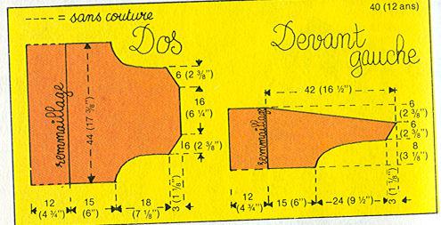 Aux 8ème et 12ème (10ème et 14ème) rgs, augm. à droite: 3 m.; puis, pour le décolleté, dim. de droite à gauche, au 14ème (16ème) rg et ts les 2 rgs: 24 m., 18 m., 18 m., et arrêter sur les 25 dernières m. (pour les 2 tailles)