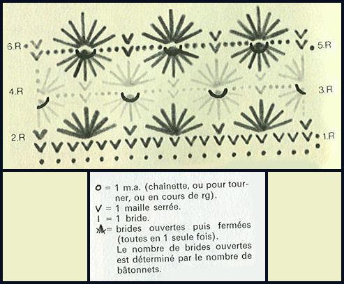 suivre le dessin explicatif dans "schéma". À la fin du 6ème rg expliqué sur le schéma, reprendre au 3ème rg et répéter toujours du 3ème au 6ème rg inclus. Travailler 2 rgs dans chacun des coloris.