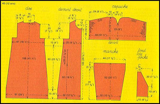 Avec la couleur rouge, tric. 1 rg de brides au bord de chaque devant en faisant 1 m.s. dans chaque rg du travail, suivie de 1 m. en l'air: piquer le crochet sous la br. de bordure, faire 1 jeté et le tirer en boucle, 1 jeté pour couler les 2 boucles ensemble, puis 1 m. en l'air avant de piquer le crochet sous la br. de bordure du rg suivant, etc. Border le bas de chaque manche par 1 m.s. faite dans chaque m. impaire et 1 m. en l'air au-dessus des m. paires. Avec la laine vertes, border l'encolure par 1 rg de m.s.; puis, pour nouer sous le menton, ajouter de chaque côté du premier rang 60 m. en l'air et faire 2 rgs de brides en passant également sur l'encolure. Coudre alors le bas de la capuche sur les mailles de l'encolure. Border par 1 rg de m.s. en vert les fentes des poches.