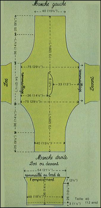 Remmailler au bas de l'empiècement devant, sur la m. qui longe les m. lis.: 75 (79) m. régulièrement réparties. Trav. en jersey. Au 4ème rg et ts les 4 rgs, dim. de chaque côté: 4 fs 1 m. (pour les 2 tailles), et continuer droit. À 33 (33) cm de haut. tot., faire 1 rg de trou-trous, puis 3 cm de jersey sur les 67 (71) m. restantes et rabattre.