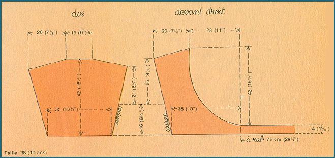À 37 (37) cm de haut. tot. et ts les rgs, dim. de chaque côté: 2 fs 3 m., 10 fs 2 m. (4 fs 3 m., 8 fs 2 m.), et arrêter. Les 21 (21) m. restant au milieu sont celles de l'encolure, qui droite.