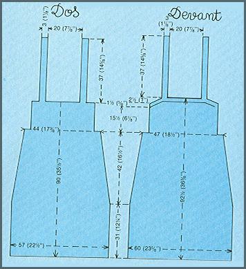 À 90 (90) cm de haut. tot., rab. les 14 (18) premières m., tric. les 13 (13) m. suivantes en faisant la première et la dernière de ces 13 m. en lis. mousse perlée, rab. les 83 (85) m. suivantes, tric. les 13 (13) m. suivantes comme les 13 précédentes, et rab. les 14 (18) dernières m. Continuer à travailler séparément, droit, sur les 13 m. laissées pour les bretelles de chaque côté. Faire 37 (37) cm et rabattre.