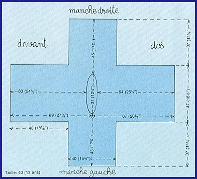 À 45 - 46.5 cm de haut. tot. (= 76ème - 79ème rg), partager le travail en 2 parties, comme suit: laisser les 134 - 134 m. de droit en attente (pour le dos) et travailler sur les 139 - 139 m. de gauche (pour le devant). Au 77ème - 80ème rg et ts les rgs, dim. côté encolure: 2 fs 2 m., 6 fs 1 m. (pour les 2 tailles) et continuer droit. Au 118ème - 121ème rg et ts les rgs, augm. côté encolure: 2 fs 1 m., 2 fs 2 m. (pour les 2 tailles). Trav. alors à nouveau sur toutes les m. pour fermer l'encolure. Continuer droit. À 84 - 87 cm de haut. tot. (= 140ème - 146ème rg), dim. 96 - 96 m. de chaque côté et trav., pour la manche droite en continuant droit sur les 81 - 81 m. du milieu. À 121 - 124 cm de haut. tot. (= 202ème - 208ème rg), arrêter.