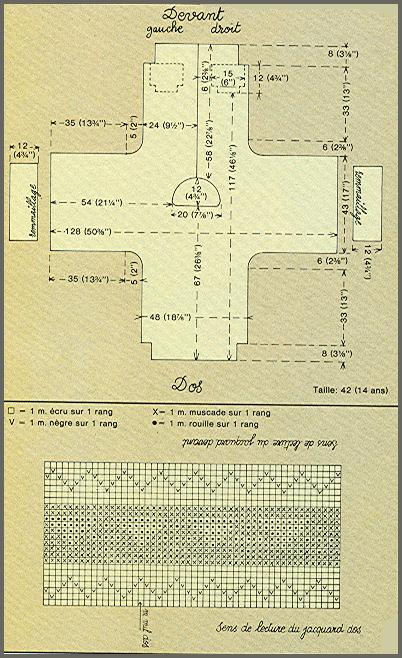 JerseyJacquard: Suivre la grille à points comptés, en la lisant dans le sens où elle est donnée pour le haut du dos et en la retournant pour faire les devants, afin que le dessin soit en vis-à-vis, c'est-à-dire que les pointes des triangles de couleur rouille doivent être dirigées vers le bas aussi bien du dos que des devants.