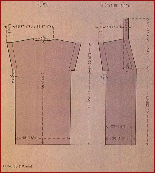 À 63 - 63 cm de haut. tot., faire, de chaque côté, 1 augm. entre la 2ème et la 3ème m. comptées à partir du bord et simultanément, ajouter de chaque côté, au bord, 4 m. en 1 fois = 5 augm. de chaque côté (pour les 2 tailles). Continuer en tricotant de chaque côté 8 - 8 m. mousse pour la bordure des mancherons et les 66 - 72 m. du milieu toujours en côtes anglaises. Au 2ème rg de mousse et ts les 3 cm, augm. de chaque côté, dans les m. côtes, donc à 8 m. des bords: 8 fs 1 m. (pour les 2 tailles).