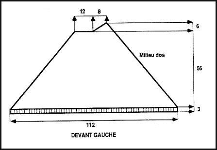 Monter 224 m. Tric. 3 cm point mousse en répart. 56 augm. au dernier rang. Cont. point fant. sur les 280 m. obtenues en commençant par 1 m. env. puis répéter de * à *. Term. par 3 m. env. au lieu de 4.
