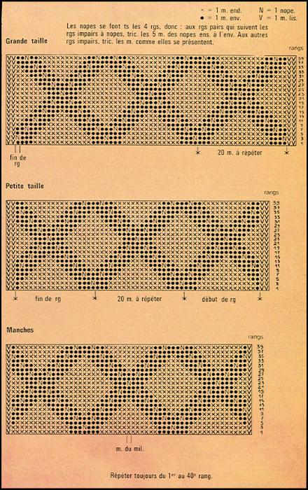 Sur les aig. 4.5 mm, monter 79 - 85 m. et tric. en côtes 1/1, droit. À 8 cm de hauteur, prendre les aig. 5 mm et tric. au point de losanges à nopes, en suivant la grille à points comptés. Travailler droit.