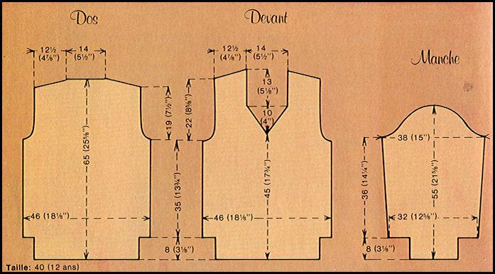 Sur les aiguilles 4.5 mm, monter 43 - 43 m. et tric. en côtes 1/1 droit. À 8 - 8 cm de hauteur, prendre les aig. 5 mm et tric. 1 rg envers sur l'envers du travail en faisant 12 augm. régulièrement réparties. Puis continuer au point de losanges à nopes, sur les 55 - 55 m. obtenues. À 10 - 10 cm de haut. tot. et ts les 7 - 5 cm, augm. de chaque côté: 5 - 7 fs 1 m. À 44 - 44 cm de haut. tot. et ts les 2 rgs, rab. de chaque côté: 3 m., 3 fs 2 m., 4 fs 1 m., 2 fs 2 m., 2 fs 3 m., 4 m. et les 11 dernières mailles (3 m., 4 fs 2 m., 3 fs 1 m., 2 fs 2 m., 2 fs 3 m., 4 m. et les 13 dernières m. ).