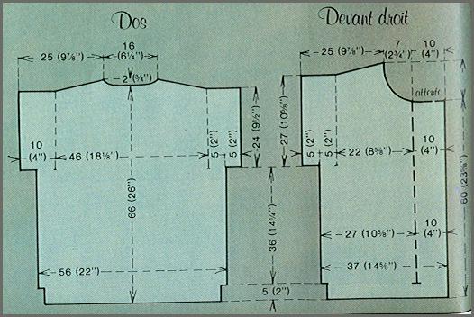 Simultanément, à 66 cm de haut. tot., rab. les 28 m. du milieu et terminer chaque côté séparément et en vis-à-vis. Rabattre encore du côté encolure, au 2ème rg au-dessus des dim. du milieu: 3 mailles.