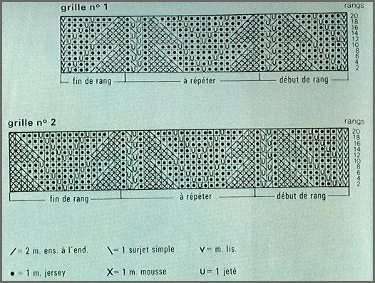 Point fantaisie: Suivre la grille à points comptés correspondant à la pièce à tricoter. La grille ne donne que les rangs pairs, tricotés sur l'endroit du travail. Sur l'envers du travail, tricoter les mailles et jetés séparément à l'envers.