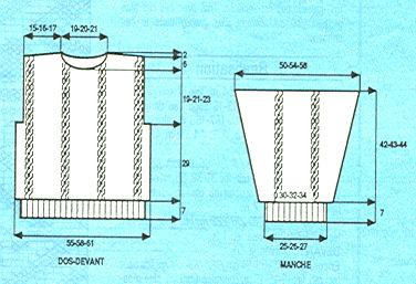 Monter 55 - 57 - 59 m. Tric. 7 cm en côte 1/1 otrse. Cont. comme suit en répart. 13 - 15 - 17 augm. au 1er rg (= 68 - 72 - 76 m.): 11 - 13 - 15 m. endr., 11 m. torsade◙, 24 m. point fant., 11 m. torsade, 11 - 13 - 15 m. endr. Cont. jersey env. sur les 11 - 13 - 15 m. de ch. côté et tric. à partir du 10ème rg sur le groupe de 11 m. torsade marqué d'un◙. Après 102 rgs de point fant., term. jersey env. sur les 24 m. correspondantes. Augm. de ch. côté: