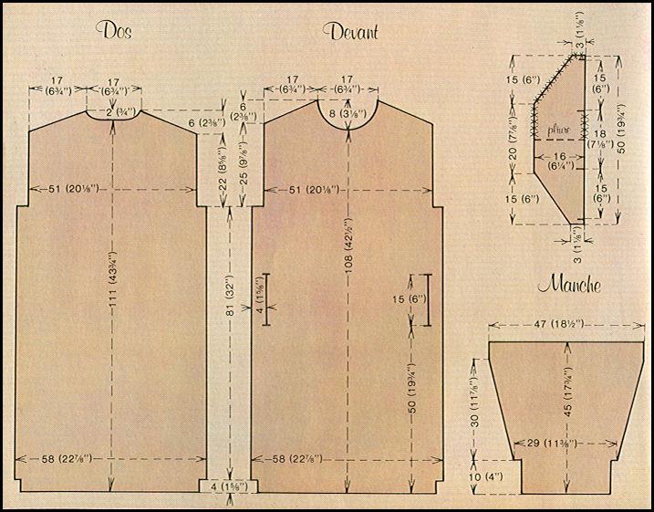 Monter 55 m. et tric. au point de riz. À 10 cm de hauteur, tric. 1 rg env. sur l,envers du travail, en faisant 3 augm. régulièrement réparties, puis continuer au point ajouré vertical. Au 5ème rg et ts les 5 rgs, augm., de chaque côté: 18 fs 1 m. et continuer droit. À 45 cm de haut. tot., rab. toutes les mailles en 1 fois.