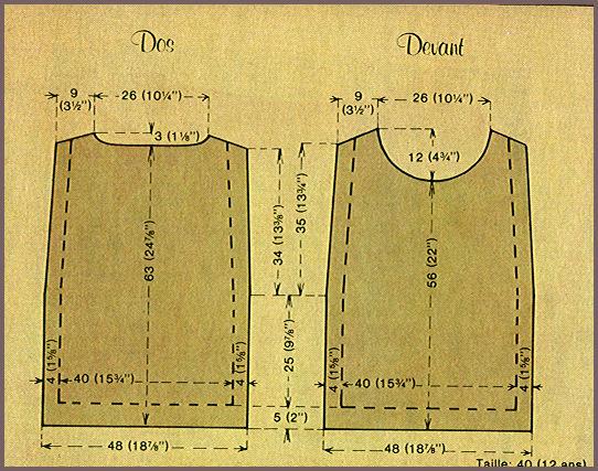 À 63 cm de haut. tot., rab. les 20 - 20 m de milieu et terminer chaque côté séparément et en vis-à-vis. Continuer à rab. côté encolure ts les 2 rgs: 1 fs 2 m., 1 fs 1 m. (pour les 2 tailles) puis terminer tout droit.