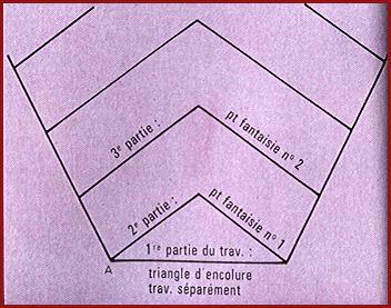 au 1er rg et alternativement 1 fs à 1 rg d'intervalle et 1 fs au rg suivant, faire 3 m.s. dans la m. de la pointe, ce qui fait 20 fs 2 augm. au milieu du rg = 40 augm. en tout. Simultanément, au 1er rg et ts les rgs, dim. de chaque côté: 2 fs 3 m., 2 fs 2 m., 1 fs 1 m.; puis alternativement *1 fs 2 m., 1 fs 1 m.*, ceci 7 fois (= 21 dim. en 14 rgs); puis: 2 fs 3 m., 9 fs 5 m. Faire un dernier rg sur les 7 dernières m. et arrêter. Casser le fil.Faire la 2ème partie du travail.
