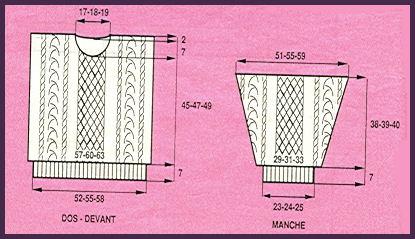 Monter 47 - 49 - 51 m. Tric. 7 cm côtes 1/1 en répart. 29 - 31 - 33 augm. au dernier rg. Cont. comme suit sur les 76 - 80 - 84 m. obtenues: