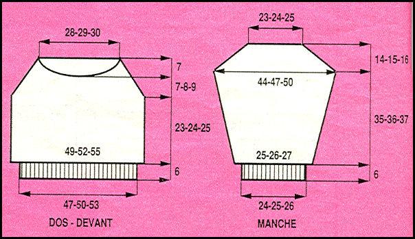 À 36 - 38 - 40 cm de haut. tot., rab. les 32 - 34 - 36 m. centrales. Cont. ch. côté séparément en rab. côté encolure ts les 2 rgs 1 fs 5 m., 1 fs 4 m., 2 fs 3 m., 3 fs 2 m., 3 fs 1 m. Après les dim. du raglan, rab. les 3 m. rest. en 1 fois.