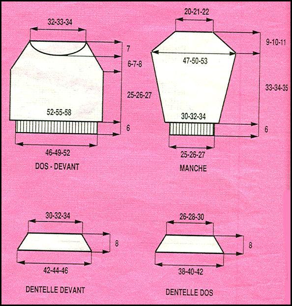 Faire les coutures. Couper la dentelle selon le croquis. Assembler les 2 parties par des coutures de long des côtés en biais. Coudre la dentelle au bord de l'encolure en l'étirant et en plaçant les coutures en prolongement de chaque milieu de manche.