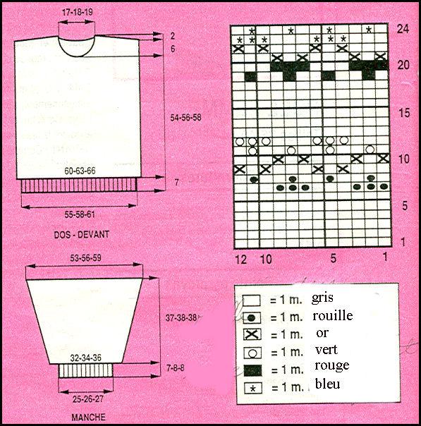 Monter 53 - 55 - 57 m. gris. Tric. 7 - 8 - 8 cm côtes 1/1 en répart. 18 - 20 - 22 augm. au dernier. rg. Cont. jacquard sur les 71 - 75 - 79 m. obtenues. Au 7ème rg, centrer 3 m. gris.