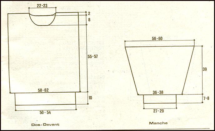 Faire les coutures (resserrer celles-ci lorsqu'elles se trouvent dans 1 partie de jersey endr. afin d'obtenir les dimensions du croquis). Poser les manches au point de mailles sur 28 - 30 cm de part et d'autre des coutures d'épaules. Term. les coutures. Poser le col au point de mailles autour du décolleté.