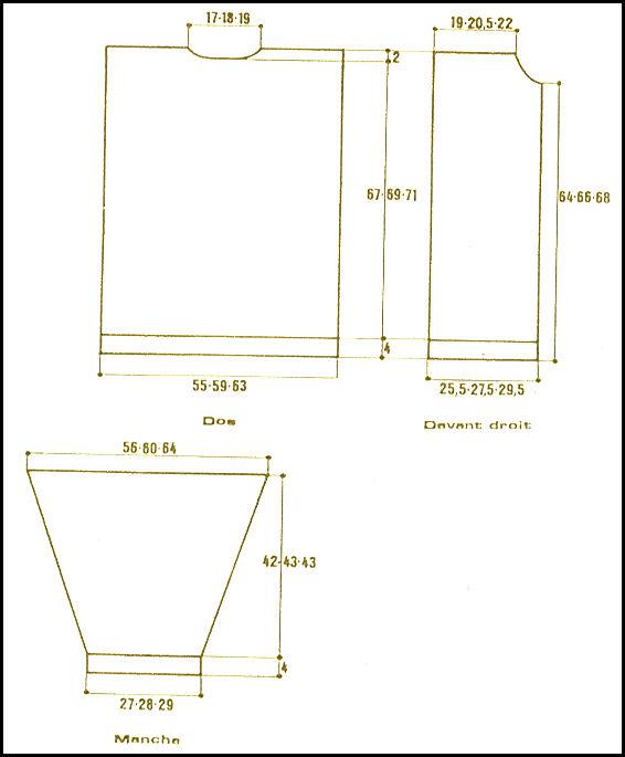 Monter 25 m. Tric. droit côtes 1/1 environ 67 - 69 - 71 cm mais la bordure droite ouvrir 6 boutonnières de 3 à 11 m. des bords, la 1ère à 3 cm du bas, les autres espacées d'environ 10 - 10.5 - 11 cm (36 - 37 - 39 rgs)