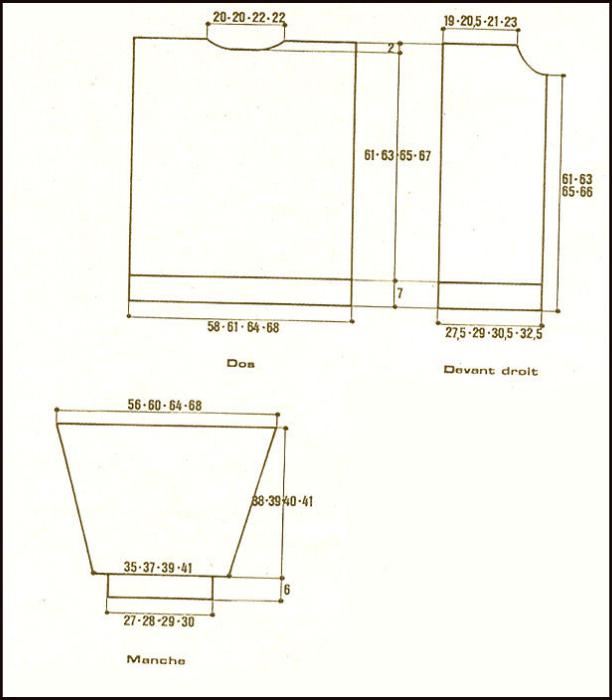 À 68 - 70 - 72 - 74 cm de haut. tot., rab. les 27 - 27 - 31 - 31 m. centrales. Cont. ch. côté séparément en rab. côté encolure ts les 2 rgs 1 fs 3 m., 1 fs 2 m.