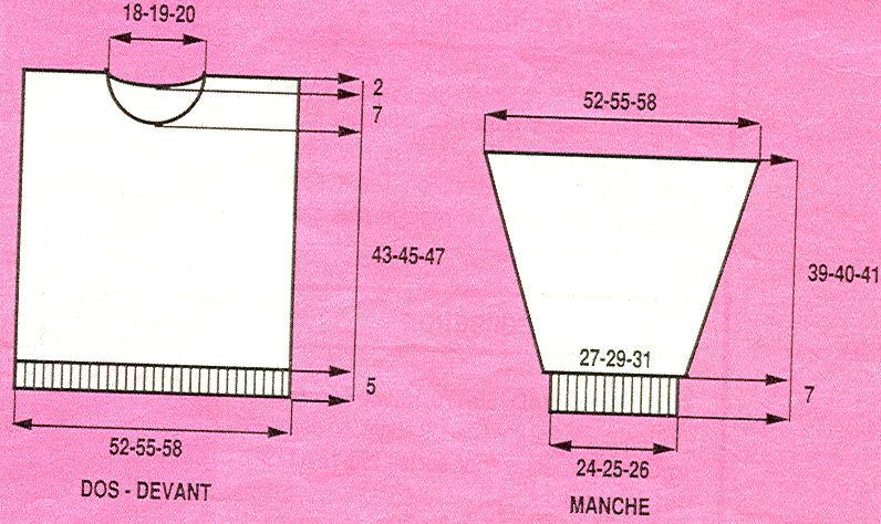 Faire les coutures d'épaules. Poser les manches au point de mailles sur 26 - 27.5 - 29 cm de part et d'autre des coutures d'épaules. Poser de même le col au point de mailles au bord de l'encolure. Terminer les coutures.