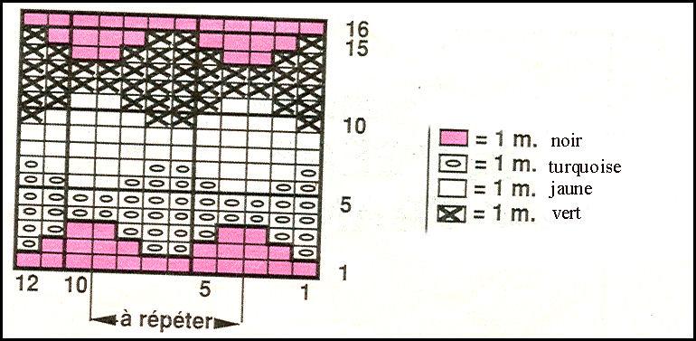 Jacquard: aig. # 3 mm. Suivre la grille. Après le 16ème rang, reprendre au 1er rang.