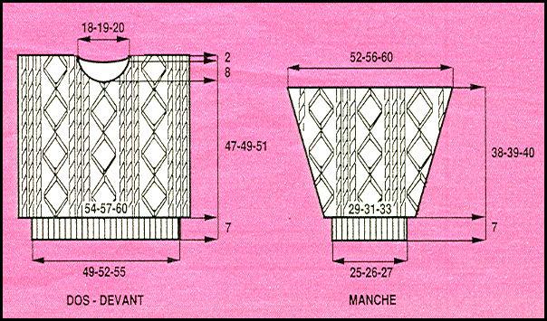 Monter 53 - 55 - 57 m. Tric. 7 cm côtes 1/1 en répart. 13 - 17 - 21 augm. au dernier rg. Cont. comme suit sur les 66 - 72 - 78 m. obtenues: