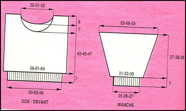 Monter 142 - 150 - 158 m. Tric. 7 cm en côtes 2/2 en répart. 16 - 18 - 18 augm. au dernier rang. Cont. droit au point fant. sur les 158 - 168 - 176 m. obtenues en commençant: