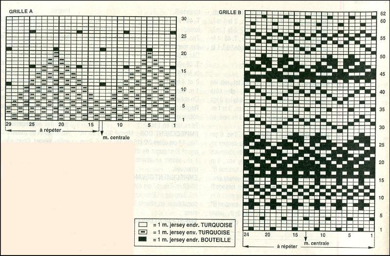 Monter 51 - 53 - 55 m. en rouge. Tric. 7 cm côtes 1/1 en répart. 6 - 6 - 8 augm. au dernier rg. Cont. point de blé et jacquard comme au dos sur les 57 - 59 - 63 m. obtenues en centrant la m. 13 de la grille "A" et la m. 13 de la grille "B".