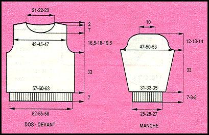 À 56.5 - 58 - 59.5 cm de haut. tot., rab. les 11 - 13 - 15 m. centrales. Cont. ch. côté séparément en rab. côté encolure ts les 2 rgs: 1 fs 3 m., 3 fs 2 m., 4 fs 1 m.