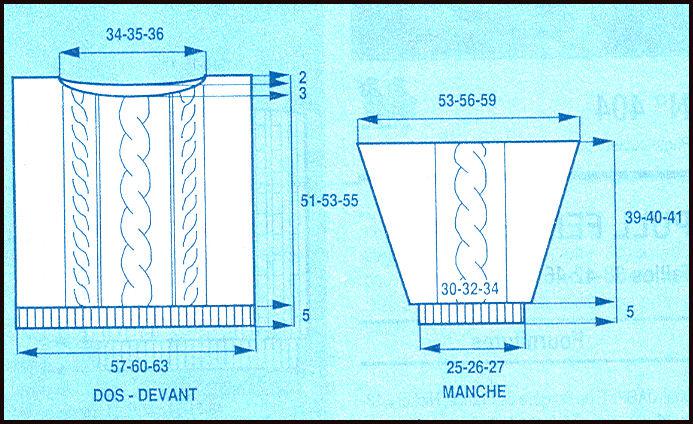 Monter 55 - 57 - 59 m. Tric. 5 cm côtes 1/1 en répart. 11 - 13 - 15 augm. au dernier rg. Cont. comme suit sur les 66 - 70 - 74 m. obtenues: 18 - 20 - 22 m. point de blé, 10 m. jersey env., répart. 10 augm. sur les 10 m. suiv. et tric. 20 m. torsade centrale, 10 m. jersey env., 18 - 20 - 22 m. point de blé.
