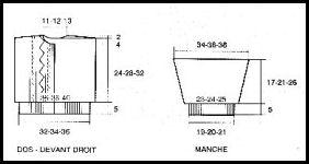 Faire les coutures d'épaules. Poser les manches au point de mailles 17 - 18 - 19 cm de part et d'autre des coutures d'épaules. Poser le col au point de mailles au bord de l'encolure, le replier par moitié sur l'env. et ourler. Poser au point de mailles les bordures le long des devants. Term. les coutures. Coudre les boutons.