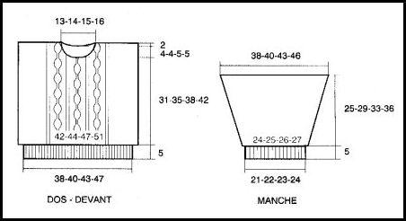 Monter 70 - 74 - 80 - 86 m. Tric. 5 cm côtes 2/2 en répart. 8 augm. au dernier rang. Cont. droit jersey endr. sur les 78 - 82 - 88 - 94 m. obtenues.