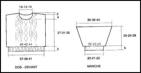 Monter 113 - 119 - 125 m. Tric. 5 cm côtes 1/1 en répart. 15 augm. au dernier rg. Cont. droit comme suit sur les 128 - 134 - 140 m. obtenues: 29 - 32 - 35 m. point fant., 70 m. pour former le plastron (= 2 m. jersey env., 2 m. torsade "A", 9 m. point ajouré, 2 m. torsade "A", 10 m. torsade "B", 2 m. torsade "A", 16 m. losange, 2 m. torsade "A", 10 m. torsade "B", 2 m. torsade "A", 9 m. point ajouré, 2 m. torsade "A", 2 m. jersey env.), 29 - 32 - 35 m. point fant.